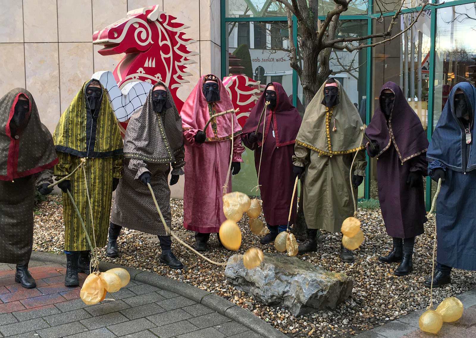 Im Gänsemarsch ziehen sie am Umzug mit und „knellen“ mit ihren Peitschen. Sie sind unmaskiert.