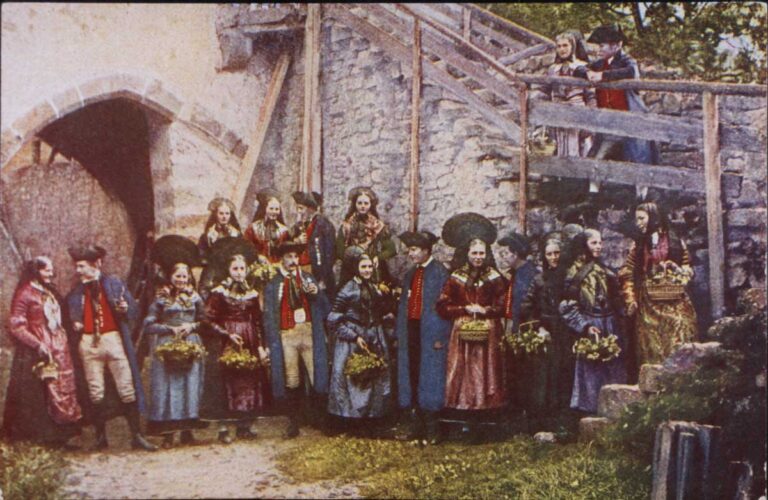 Die rot-, grün-, blau- oder violettseidenen und stark wattierten Bauschmutzen und die in den Farben stets korrespondierenden Schürzen, sowie die schweren, schwarzen Tuchröcke gehören dieser Kleidung an.