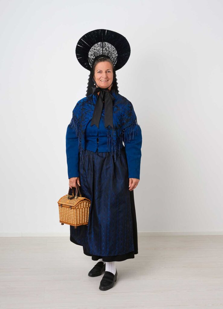 Dazu wird ein reich verziertes Schultertuch getragen, zusammengehalten mit einer Brosche. Ein Tragekörbchen ergänzt die weibliche Tracht.