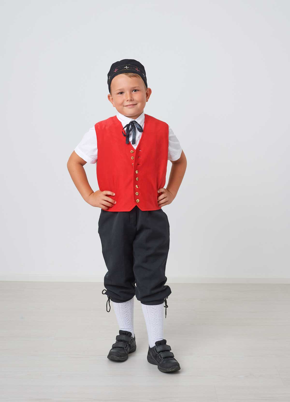 Die Tracht der Männer steht in Ausstattung und Farbenpracht der der Frauen nicht nach. Zu braunen enganliegenden Hirschlederkniebundhosen mit weißen Kniestrümpfen gehört ein rotes Leibchen, dessen Rückseite aus ledernfarbenem Samt besteht.